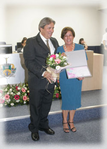 Vereador Antônio Carlos Pereira e sua homenageada Sra Letizia Dias de Campos Sanches