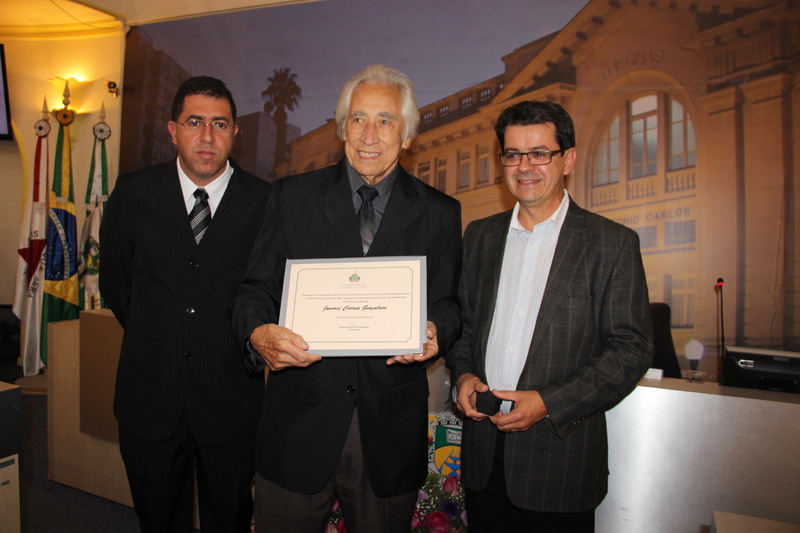 Ver. Flávio Faria, Sr. Juverci Correa Gonçalves, ex-funcionário homenageado e Sr. Jão Deom Pereira