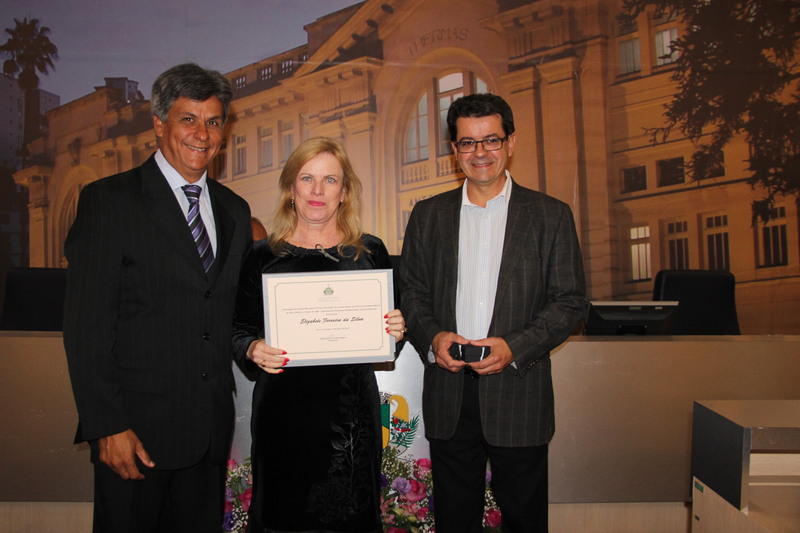 Ver. Joaquim Alves, Sra Elizabete Ferreira da Silva, funcionária homenageada e Sr. João Deom Pereira