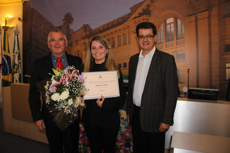 Ver. Rogério Carrilo, Sra Gislaine dos Santos, funcionária homenageada e Sr. João Deom Pereira