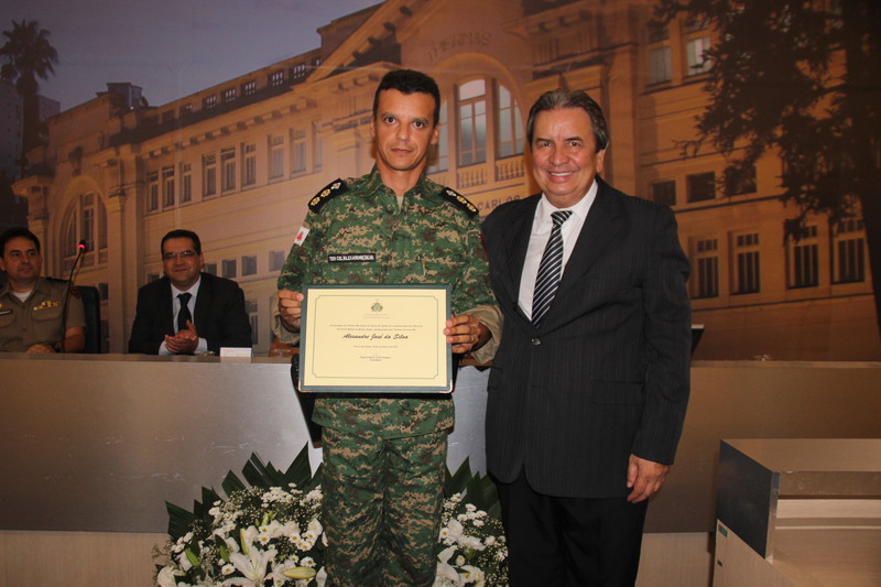 Ten. Cel. Alexandre J. da Silva recebe um diploma do Ver. Antônio C. Pereira