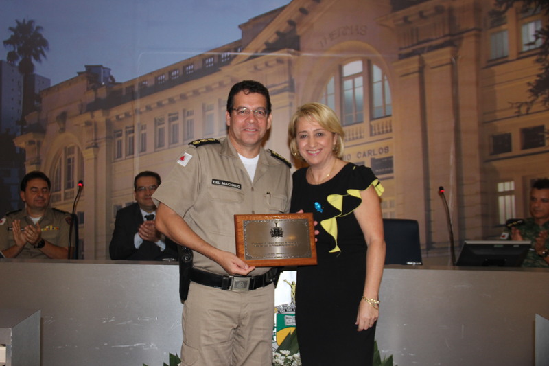 Te.Cel. Ricardo G Machado recebe da Ver. Regina Cioffi placa comemorativa destinada à 18ª Região PM