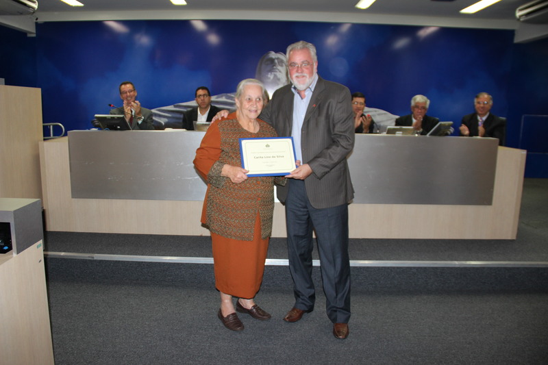 Ver. Paulo Tadeu S. D'Arcadia entrega uma homenagem à Sra Carita Lino da Silva .