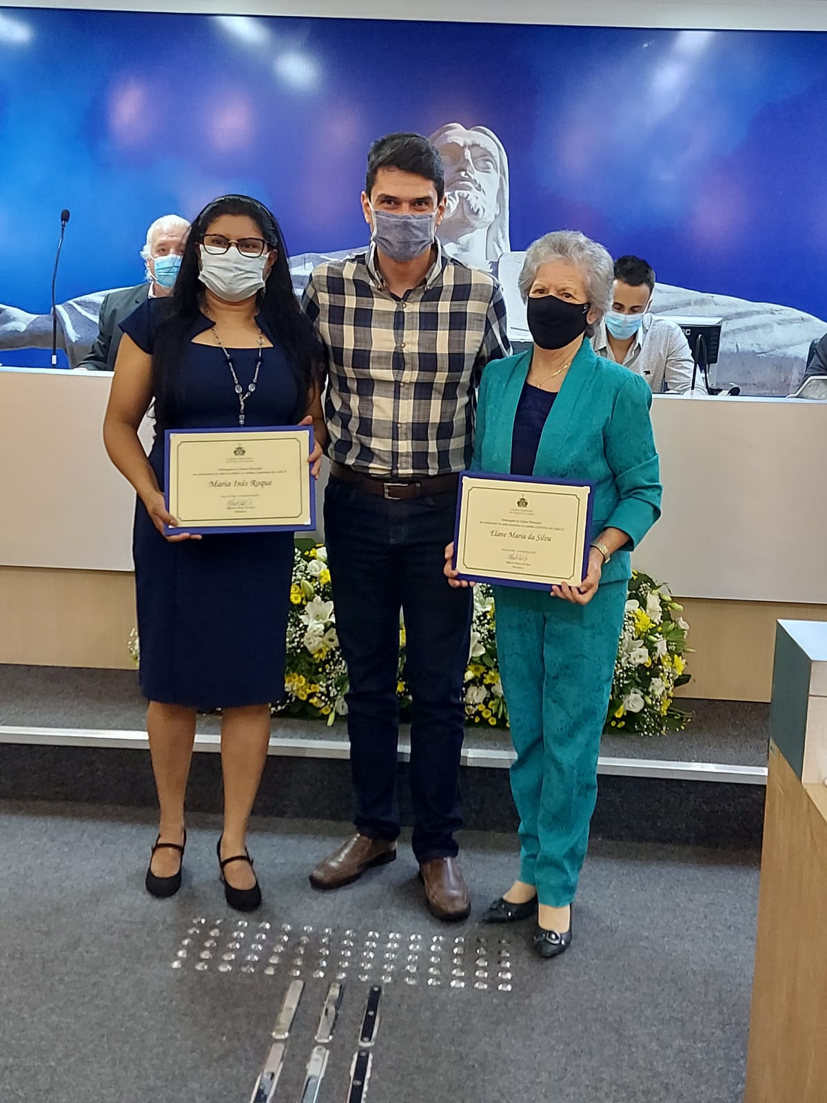 Ver. Ricardo Sabino dos Santos entrega diploma à Maria Inês Roque, responsável pela higienização na UPA, e à Sra Ceĺia Mª de Souza, representando o Hospital Santa Casa.