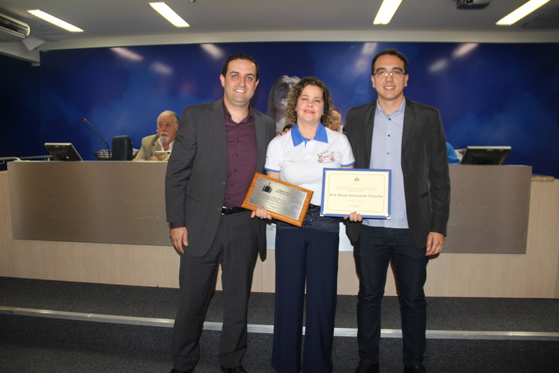 Sra Ana Paula Tranche, recebe diploma e uma placa comemorativa entregue pelos vereadores Marcelo Heitor e Lucas Arruda, proponentes da homenagem