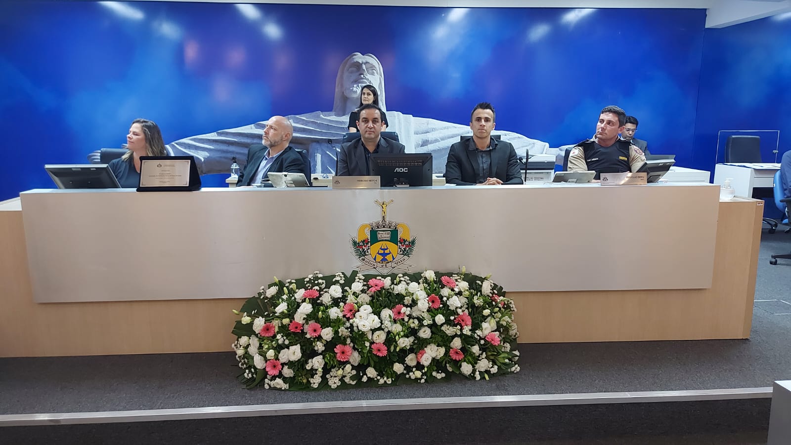 (à esq.) Ana Paula Gonçalves Tranche-Presidente da ADEFIP, Carlos Eduardo de Almeida-Secretário Municipal de Promoção Social, Ver. Marcelo Heitor da Silva-Presidente da Câmara Municipal,Ver. Douglas Eduardo de Souza-1º Secretário e Cap. Adriano Souza Médici-29º Batalhão da PM.