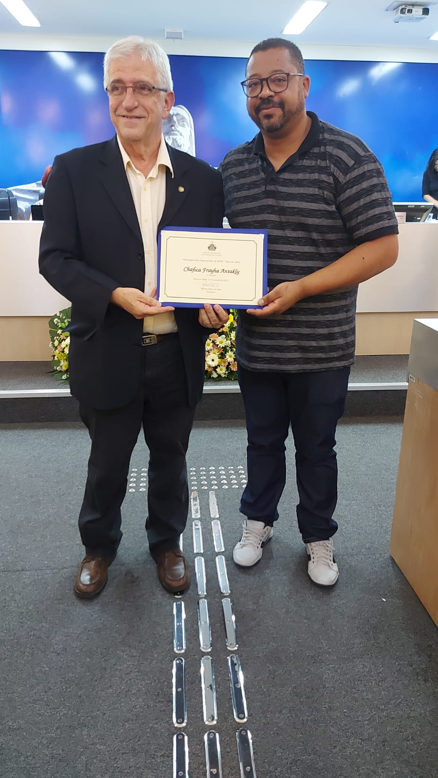 (à esq.)Sr. Gustavo Zarif Frayha, sobrinho da homenageada, Sra Chafica Frayha Antakly, primeira presidente da APAE Poços de Caldas.