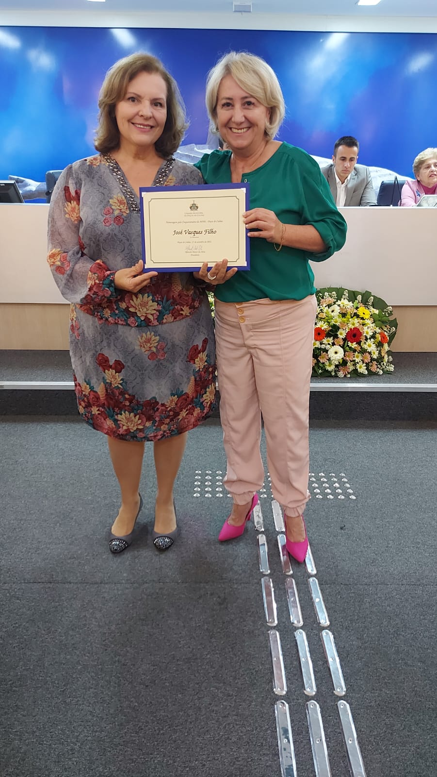 (à esq.)Sra Lúcia Vasques, sobrinha do homenageado, Sr. José Vasques Filho, ex-presidente da APAE Poços de Caldas.