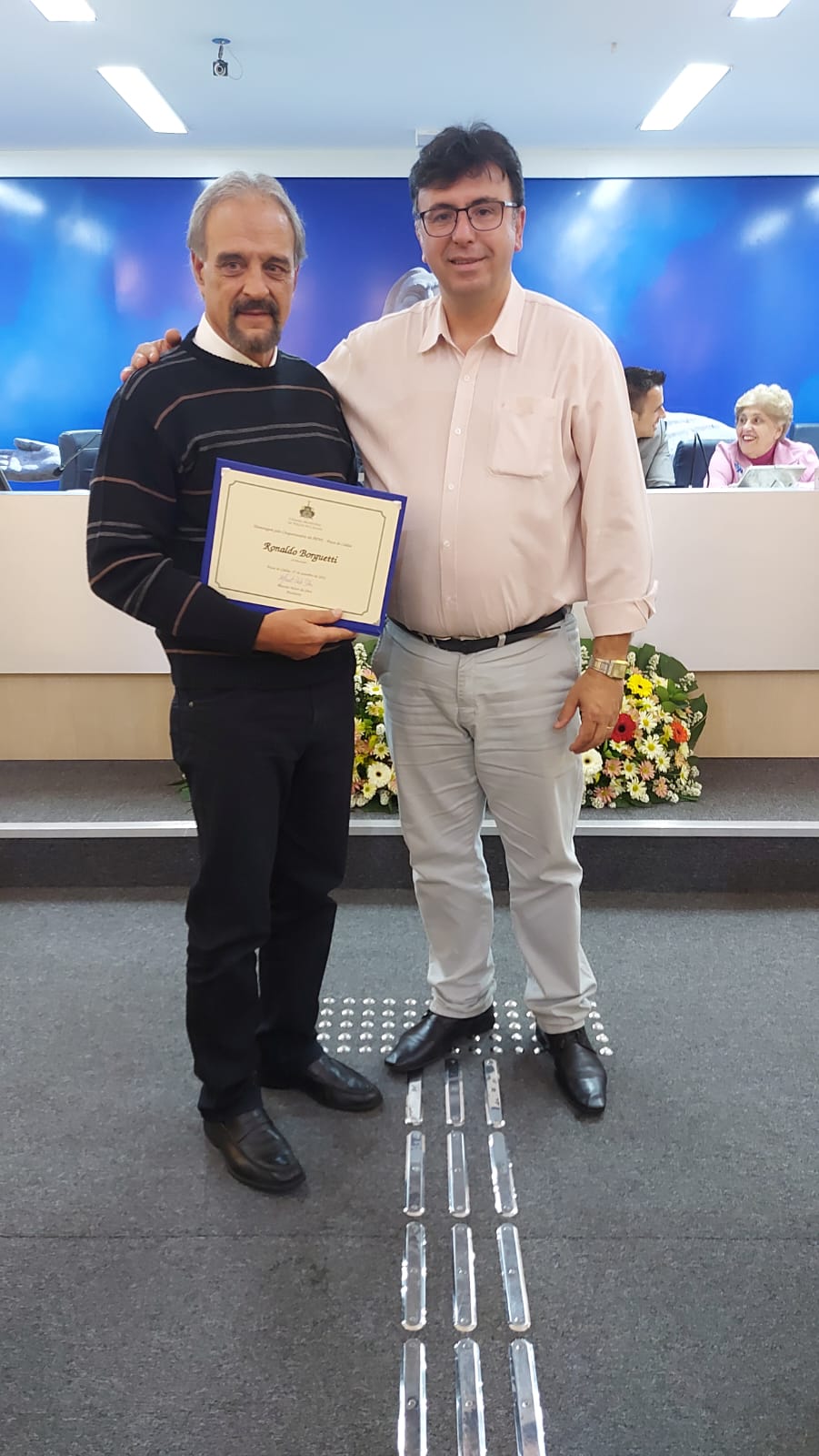 (à esq.) Sr. Ronaldo Borguethi, filho do homenageado, Sr. José Roberto Borguethi, um dos fundadores da APAE Poços de Caldas.
