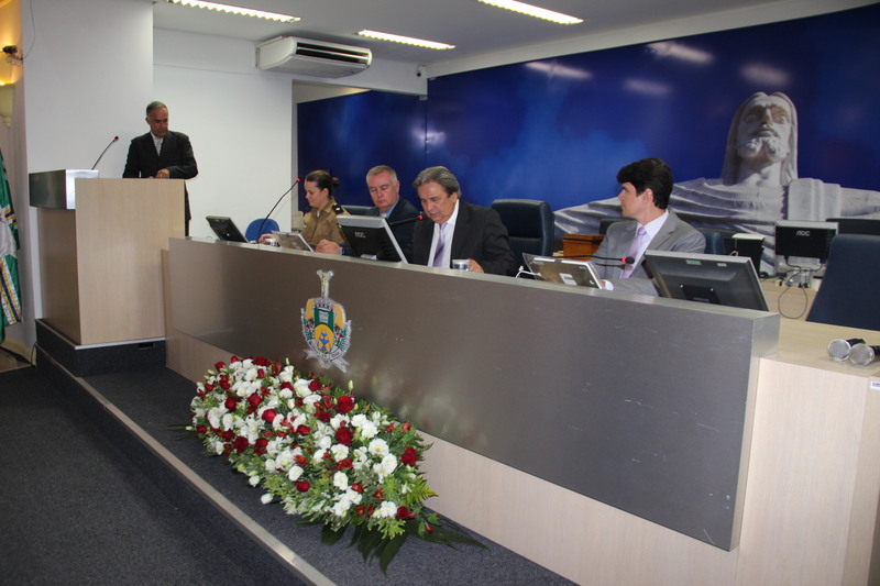 Composição da mesa: Ten Thalita/29º BPM, Sérgio Azevedo/Prefeito Municipal, Ver. Antônio Carlos Pereira/Pres. da Câmara e Ver. Ricardo Sabino/1º sec.