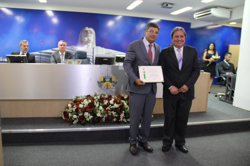Ver. Antônio Carlos Pereira(à dir.) entrega título ao Sr. Sérgio Elias Dias, homenageado do Ver. Joaquim Alves que não pode comparecer.