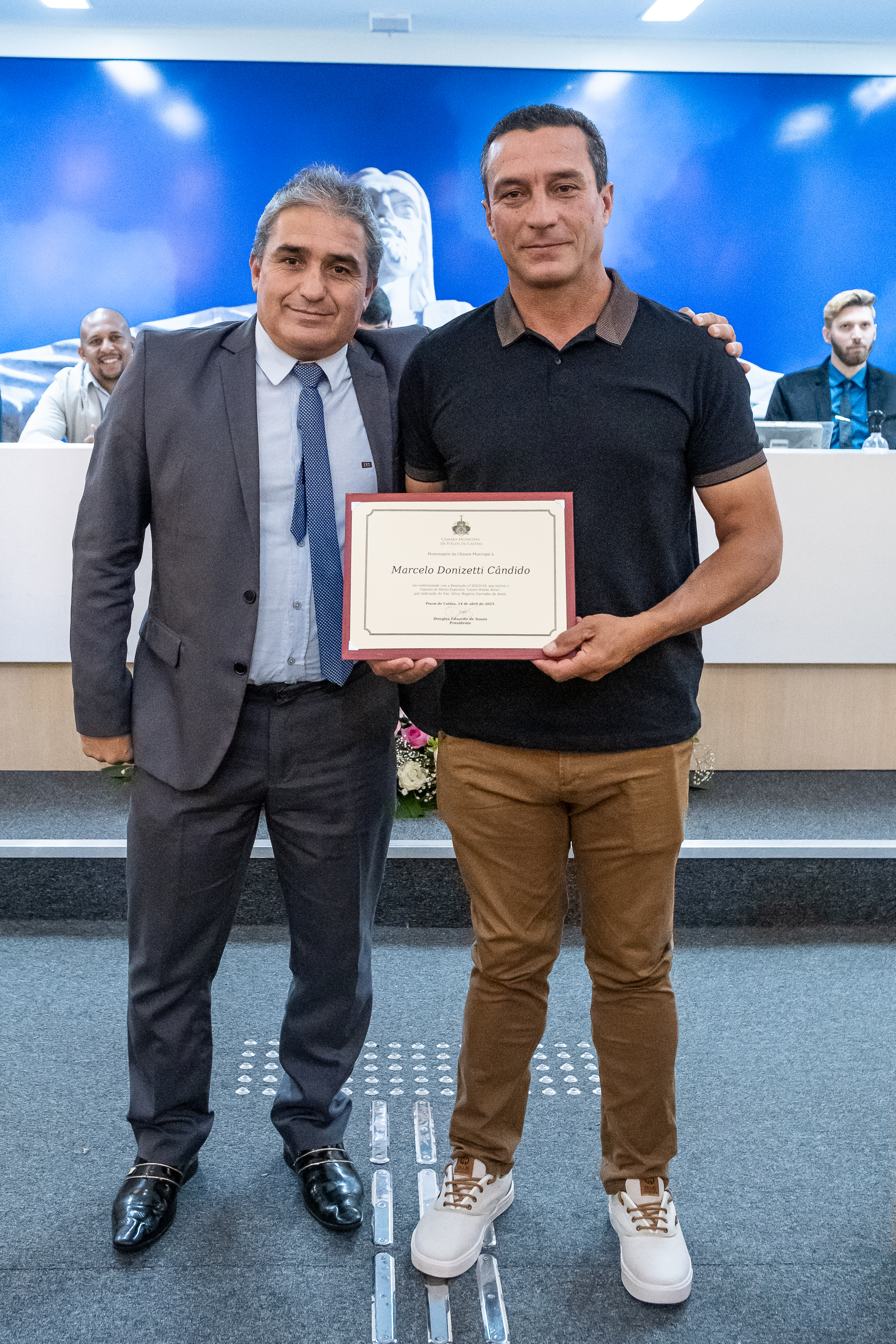 (à esq.) Ver. Silvio de Assis homenageou o Sr. Marcelo Donizetti Cândido, ex-jogador de futebol amador.