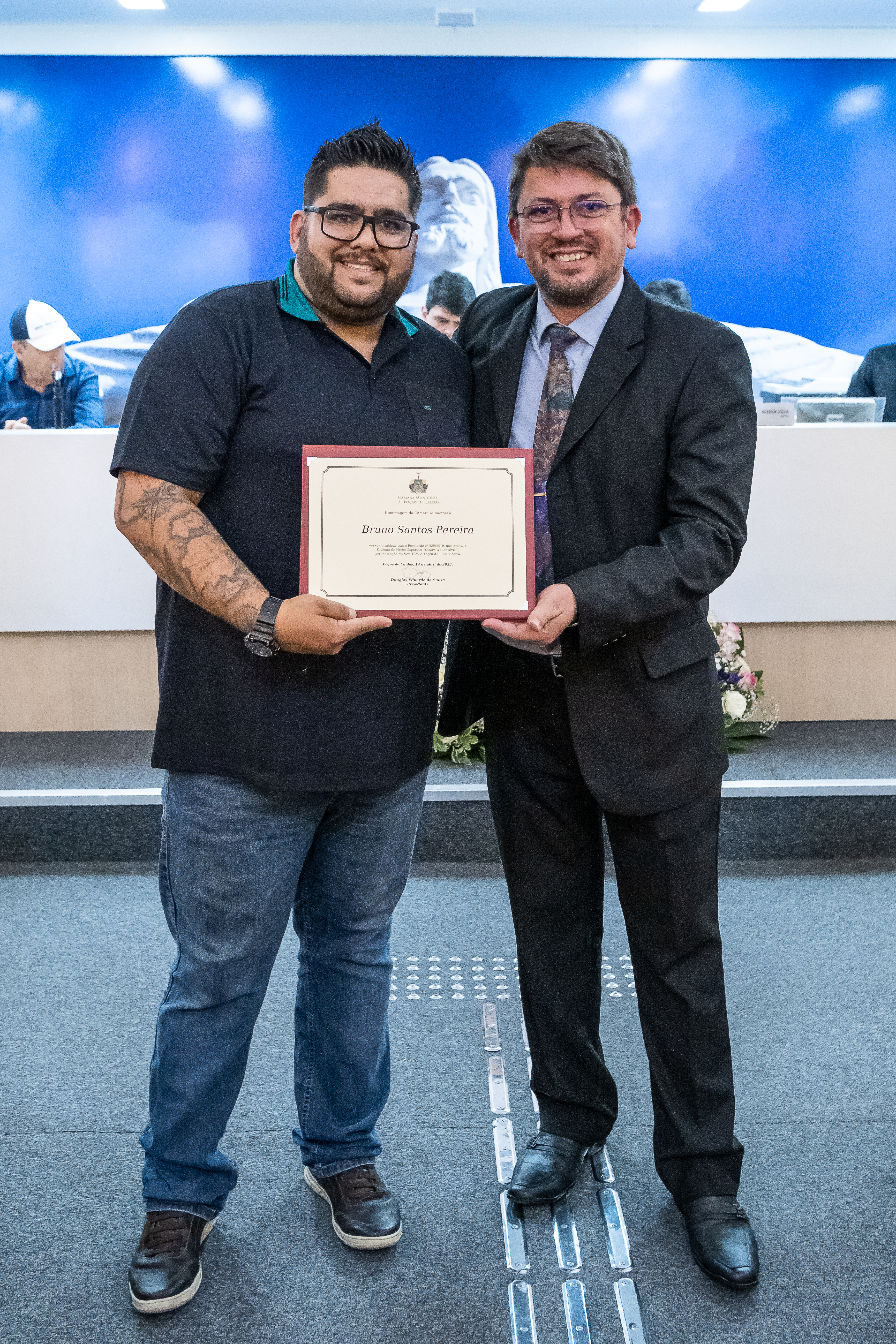 (à dir.) Ver. Flávio Togni homenageou o Sr. Bruno Santos Pereira, educador físico e um dos idealizadores do CIDEP - Centro de Desenvolvimento do Esporte Paralímpico.