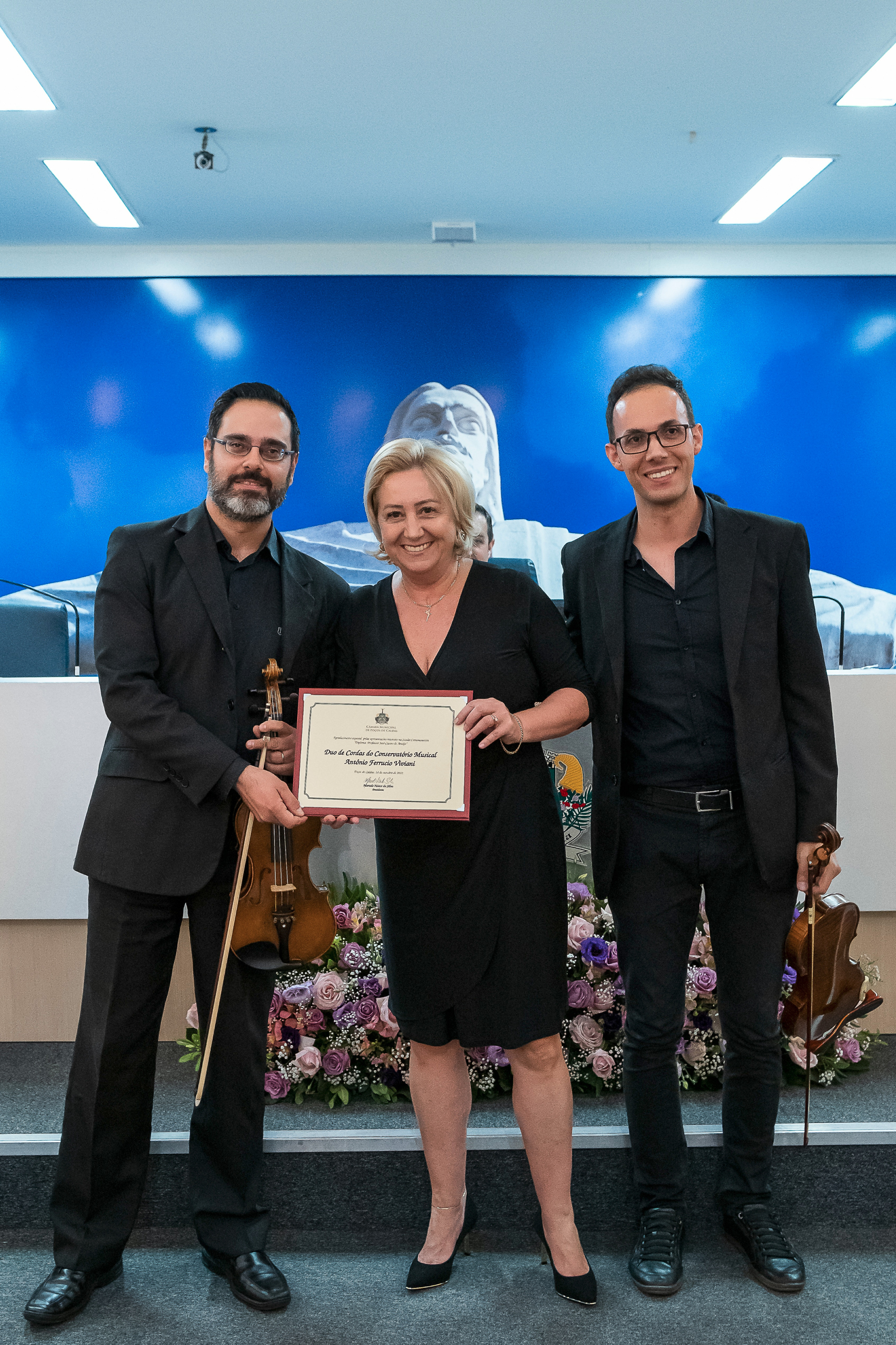 Agradecimento aos violinistas pela apresentação musical.