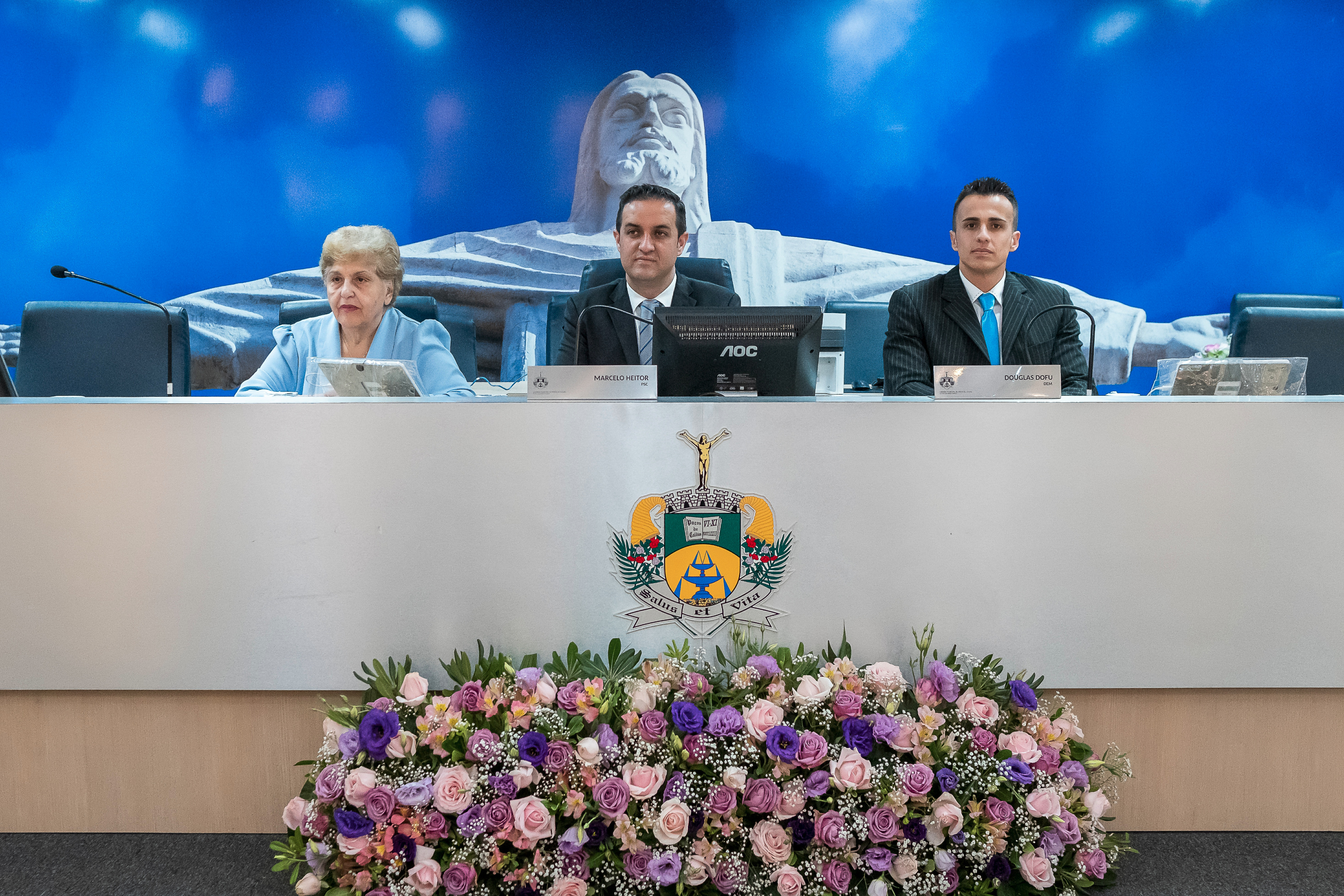 (à esq.)Sra Maria Helena Braga-Secretária Municipal de Educação, Ver. Marcelo Heitor da Silva-Presidente da Cãmara Municipal e Ver. Douglas Eduardo de Souza-1º Secretário.