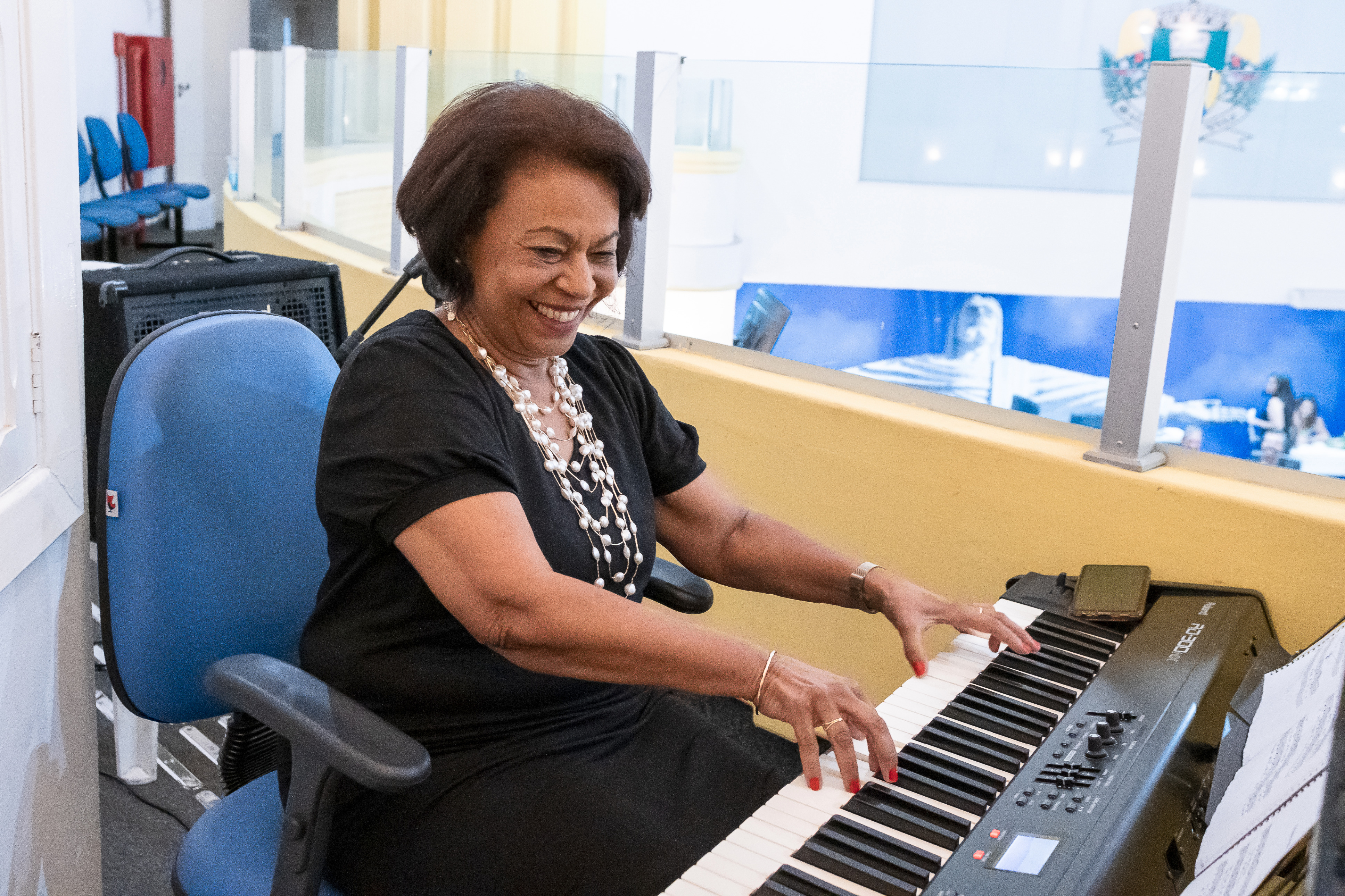 Sra Maria Inês Lobão, ao piano, acompanha o Coral Vivace.