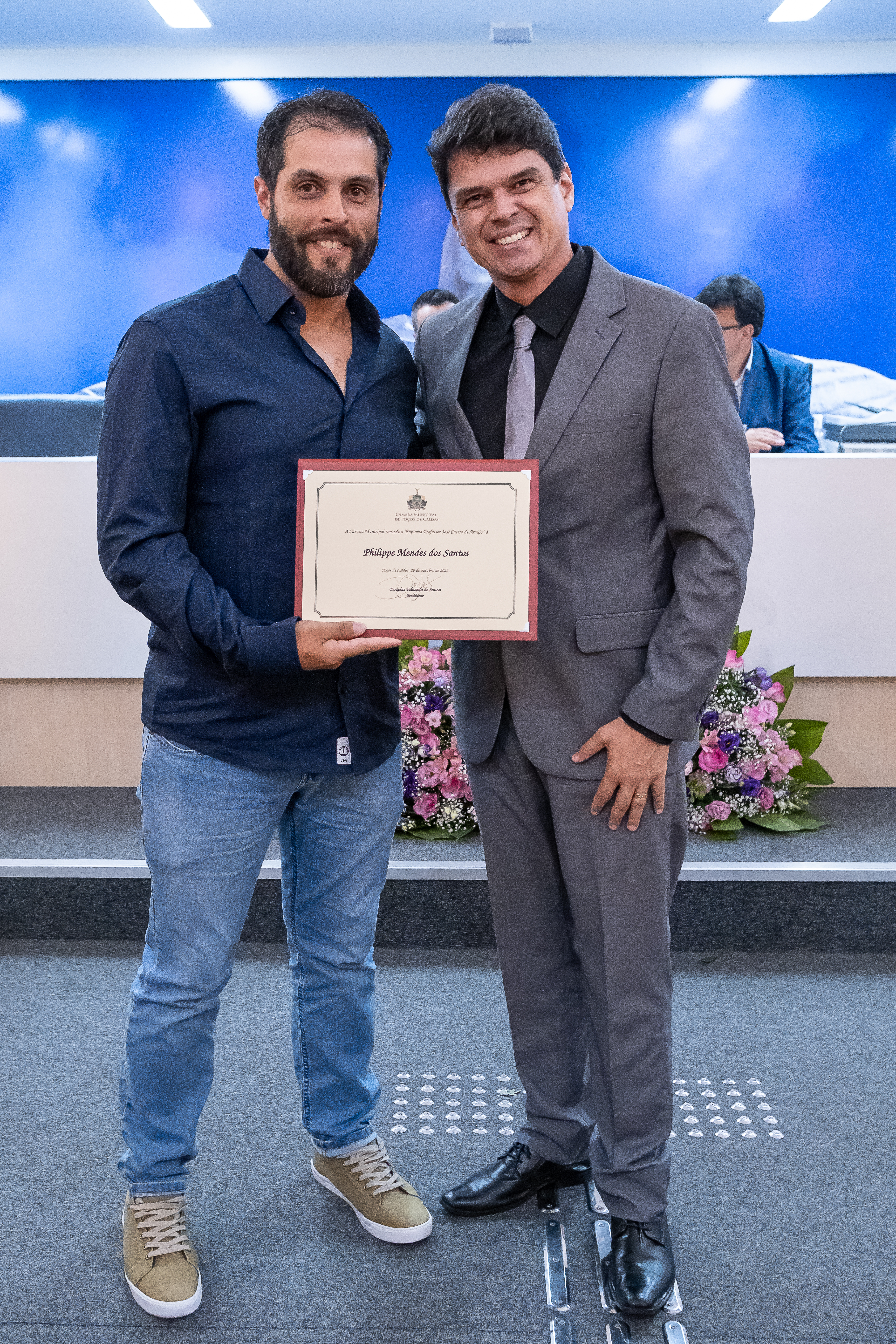 (à dir.)Ver. Ricardo Sabino homenageou o Sr. Phillippe Mendes dos Santos, professor de educação física.