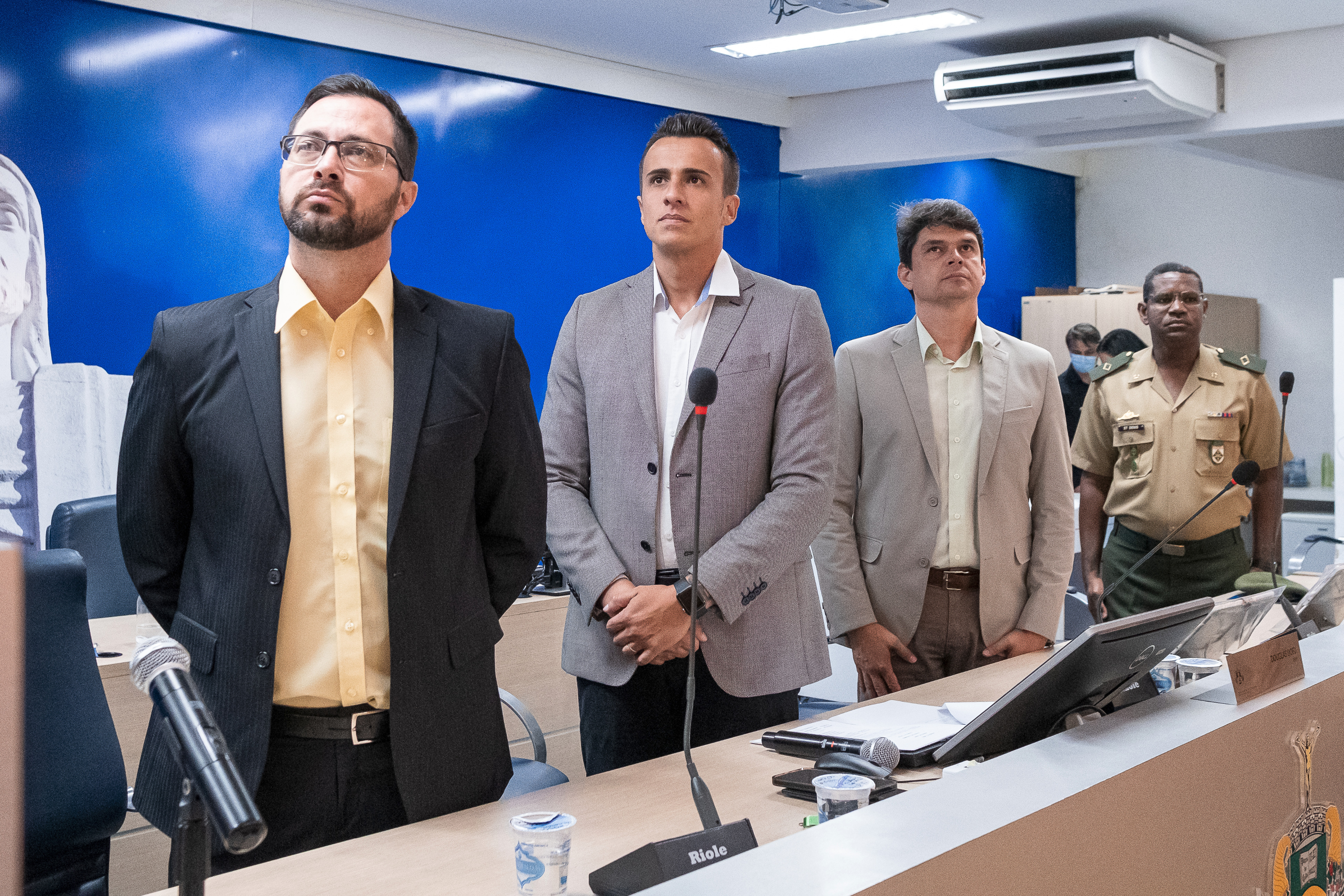 (à esq.) Rafael Tadeu Conde Maria, Secretário Municipal de Defesa Social; Ver. Douglas Eduardo de Souza, Presidente da Câmara Municipal; Ver. Ricardo Sabino, Vice-presidente e ST Denis Marins de Paula, Chefe de Instrução do Tiro de Guerra 04-021.