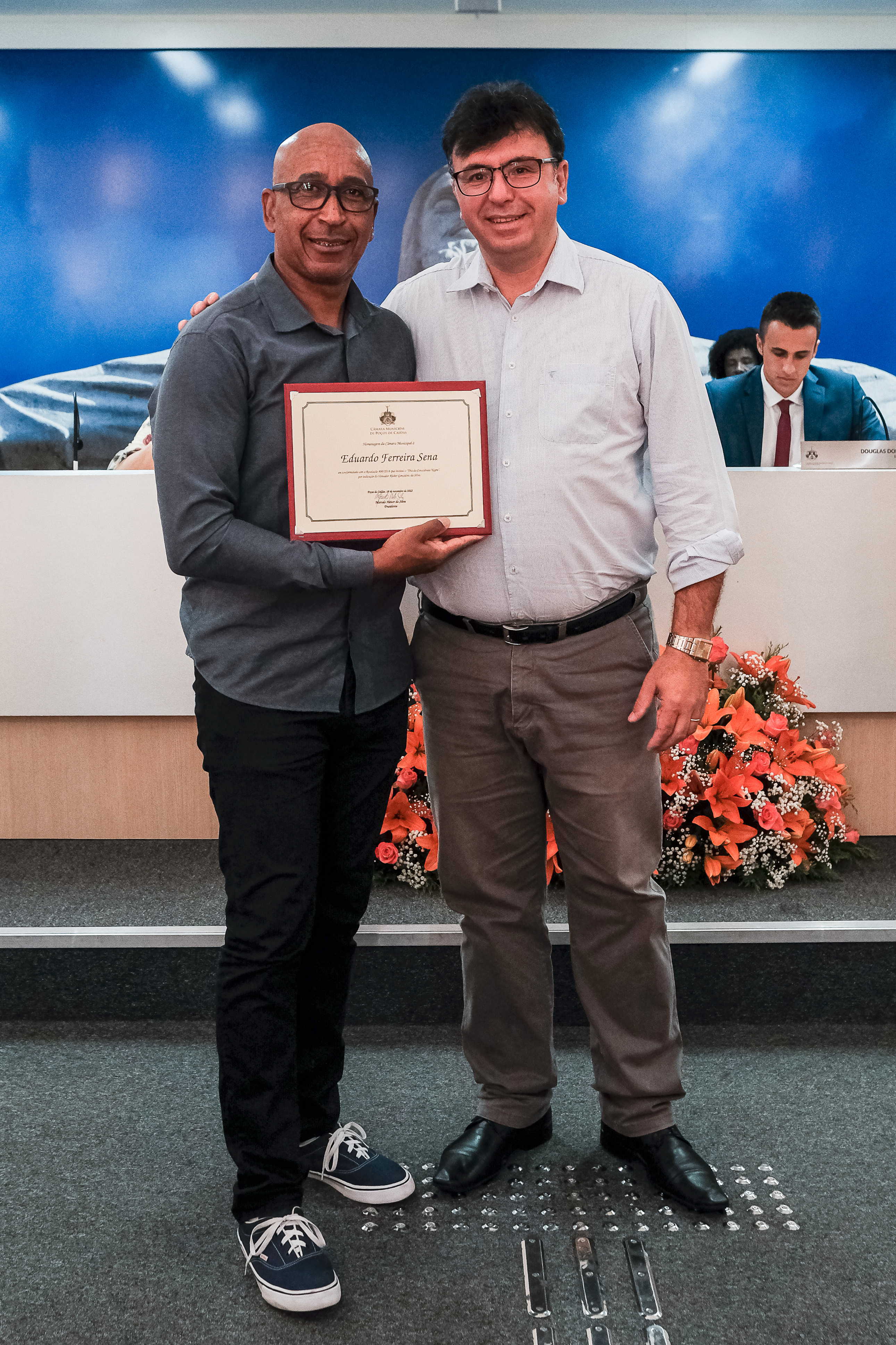(à esq.)Eduardo Ferreira Sena,professor de educação física, homenageado pelo Ver. Kleber Gonçalves da Silva.