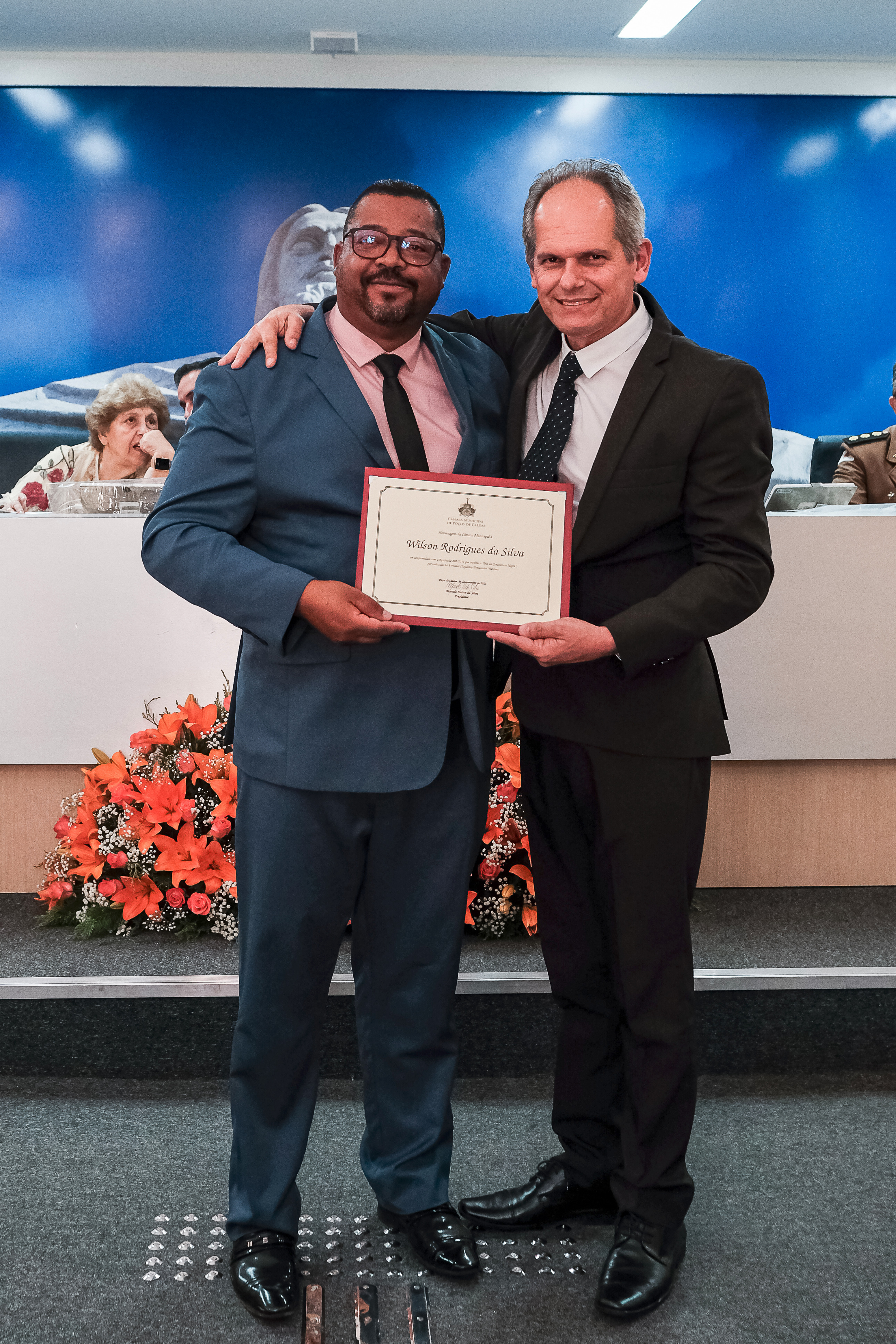 (à esq.) Ver. Wilson Rodrigues da Silva, pastor, homenageado pelo Ver. Claudiney Donizetti Marques.