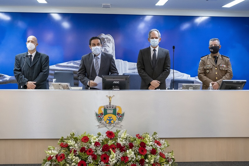 (à esq.)Carlos Eduardo Almeida, Secretário de Promoção Social,Ver. Marcelo Heitor da Silva, Ver. Claudiney Marques e Ten. Cel Jardel Trajano de Oliveira Gomes, comandante do 29º BPM.
