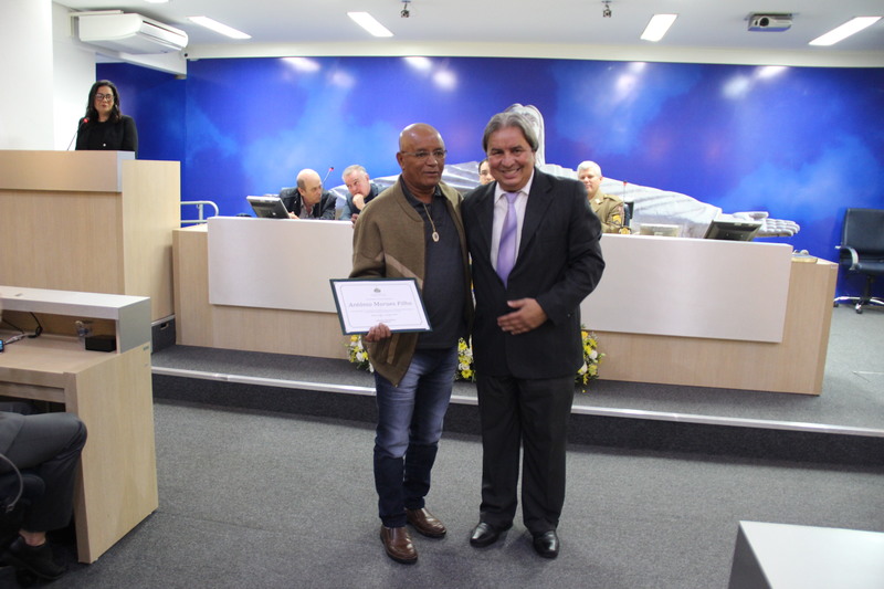 (à esq.) Sr. Antônio Moraes(Neco) é homenageado pelo Ver. Antônio Carlos Pereira.