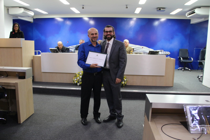 (à esq.)Prof. Aécio Hely de Oliveira é homenageado pelo Ver. Gustavo Bonafé Costa.