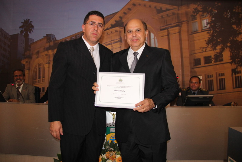 Ver. Flávio H. Faria entrega diploma ao Sr. Ildeu Pereira, diretor geral da TV Poços