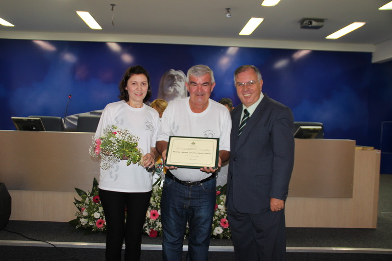 Ver Valdir Sementile e os homenageados Marlene C. Zanetti e Carlos Zanetti