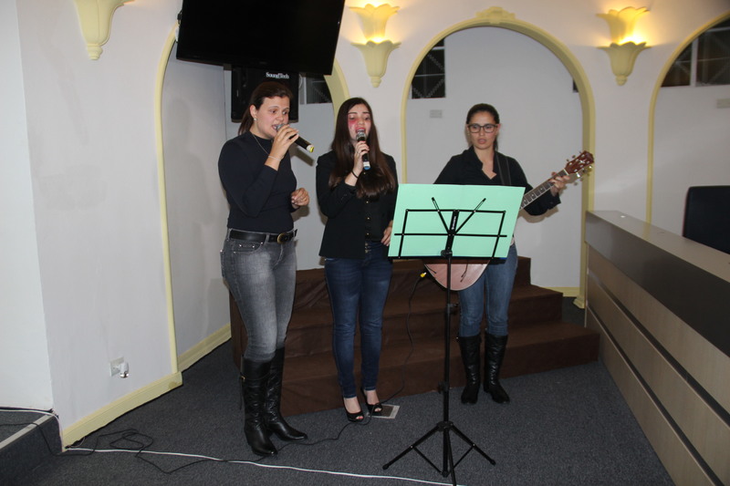 Apresentação da musicista Lais Jardim Cassaro (esq.), Sabrina Costa (centro) e Carol (dir.)