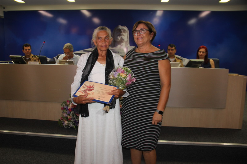 (a esq.) Sra Maria Desidéria é homenageada pela Ver. Maria Ligia Moreira de F. Podestá