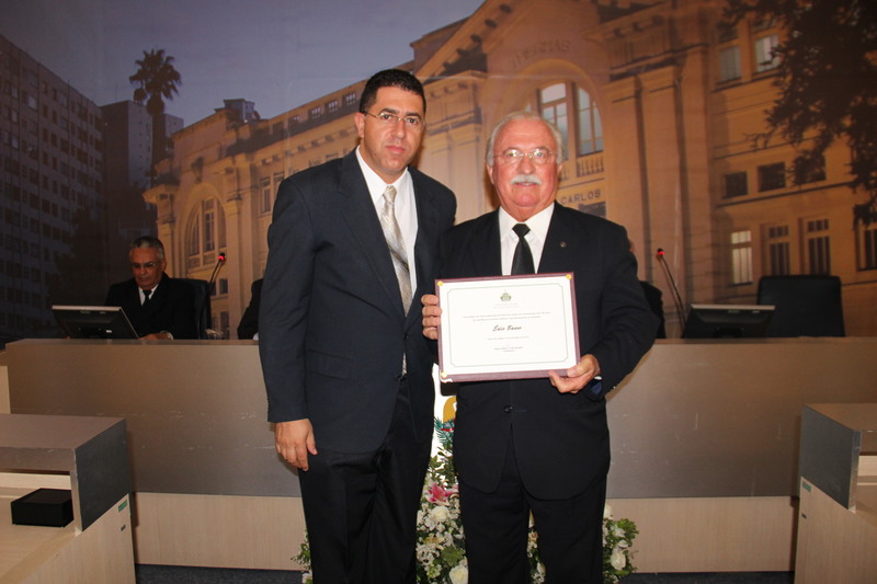 Ver. Flávio Henrique Faria(à esq.) entrega diploma ao homenageado, Sr. Édio Basso