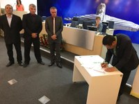 Na noite da última terça-feira (22), a Câmara de Poços realizou a cerimônia de assinatura do Ato de Irmanação entre as cidades de Poços de Caldas e Águas da Prata (SP). O evento contou com a presença do prefeito Sérgio Azevedo, do vice-prefeito da cidade de Águas da Prata Ricardo Sassaron, do presidente da Câmara de Águas da Prata vereador José Sebastião Chiodeto e de vereadores dos dois municípios.